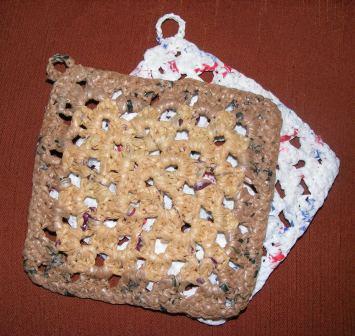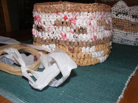 It took me a bit to figure out how to create my own plarn and subsequent projects. Finally, I stumbled across this great website. Eureka! My first couple of exploits have been small and humble, yet I am already finding fun ways to use this material and the joy of being able to manipulate color and composition by varying the types of bags and stitches used. So far, two little pot scrubbers have been born (each using up about 10 bags!) and a basket is in progress. In the basket (shown below), the spacing of different bag colors creates regular and interesting shifts in the pattern.