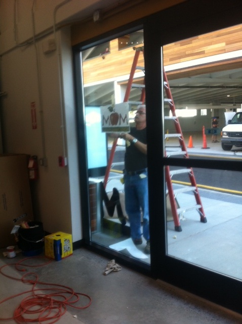 The sign guy puts finishing touches on our door logo.