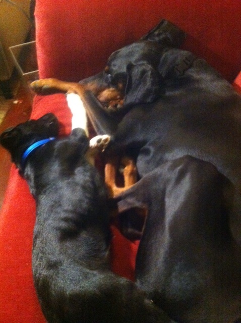 Harvey, our 2 ½ year old Doberman, was not as quickly smitten. She won him over eventually by insisting on running, jumping and chewing all over him while he tried to nap. She’s not afraid of his MMA-style matches, and is always ready to jump back in the ring if she gets knocked down.