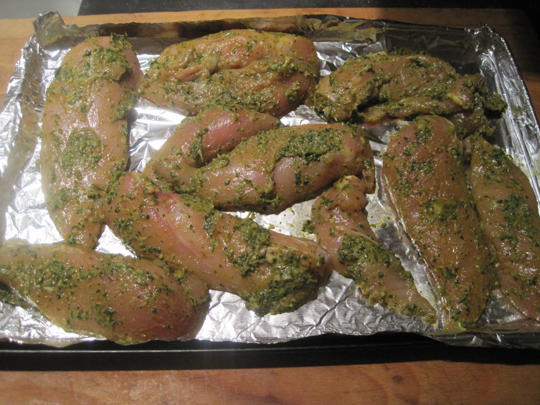 Combine the cilantro, lime juice, garlic, scallion pieces, olive oil, salt and spices into afood processor. Blend into a smooth puree. Coat the chicken on both sides with the blend, and set aside (this can be done the night before, or the evening of).