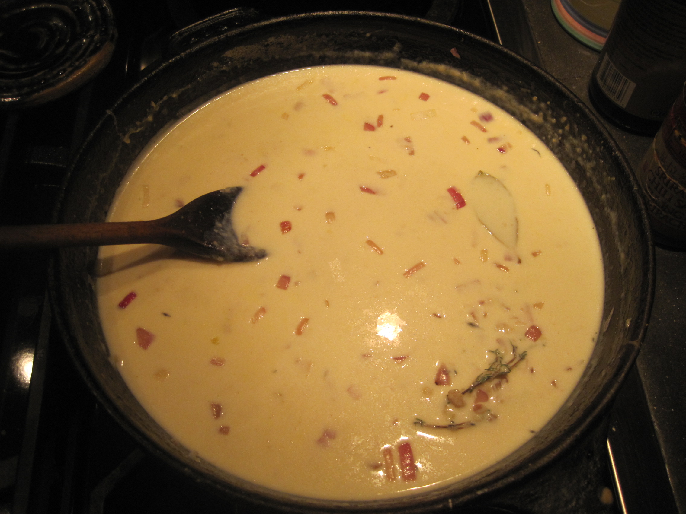 When all the milk is added, use a wooden spoon again and add the thyme sprig, bay leaf, and 1/2 tsp. salt. Let simmer for 15 minutes to meld the flavors. Then discard the thyme and bay leaf and add the cheese! Stir until melted, then add the Worcestershire and hot sauces. Season to taste with salt and pepper.