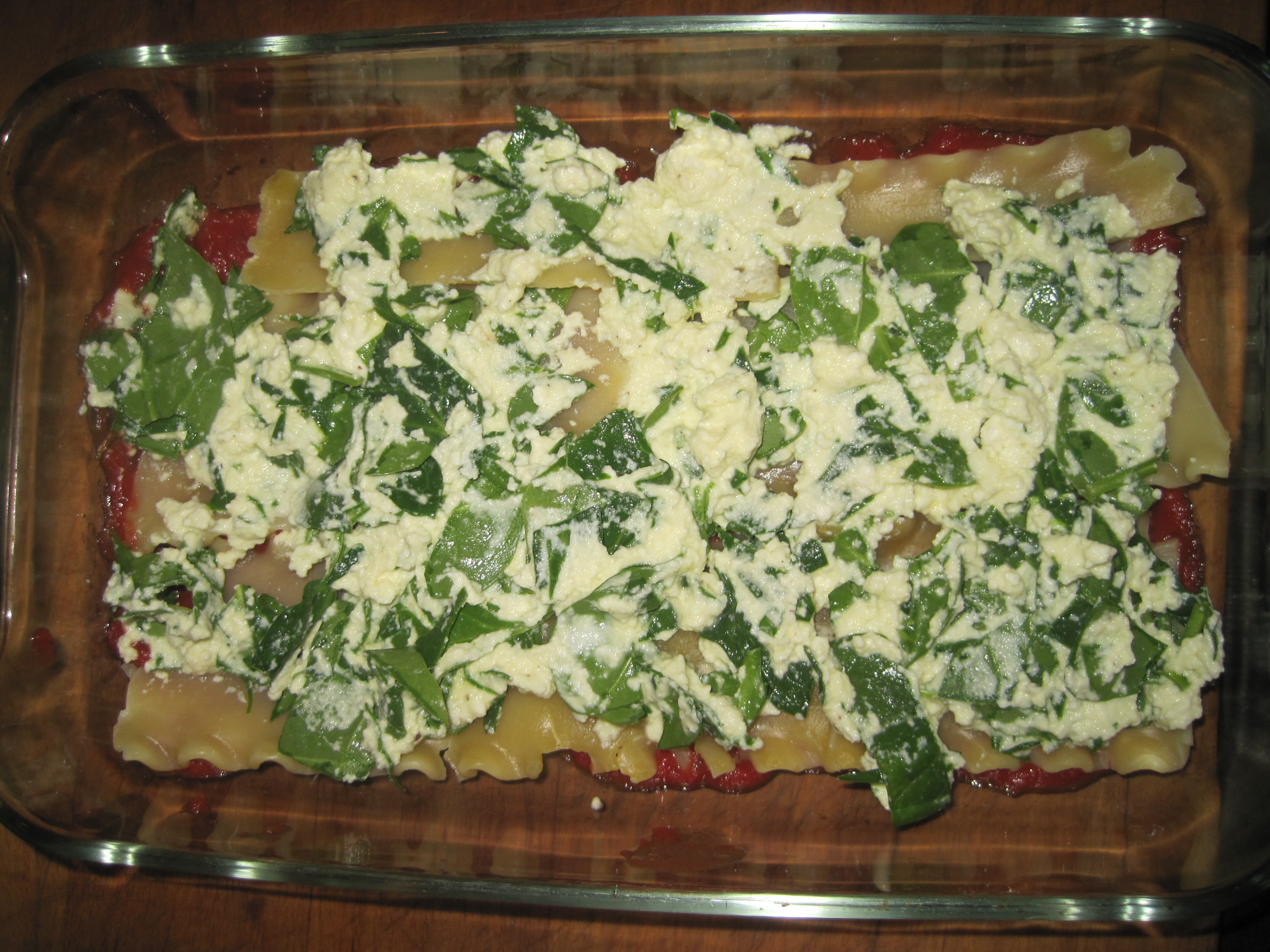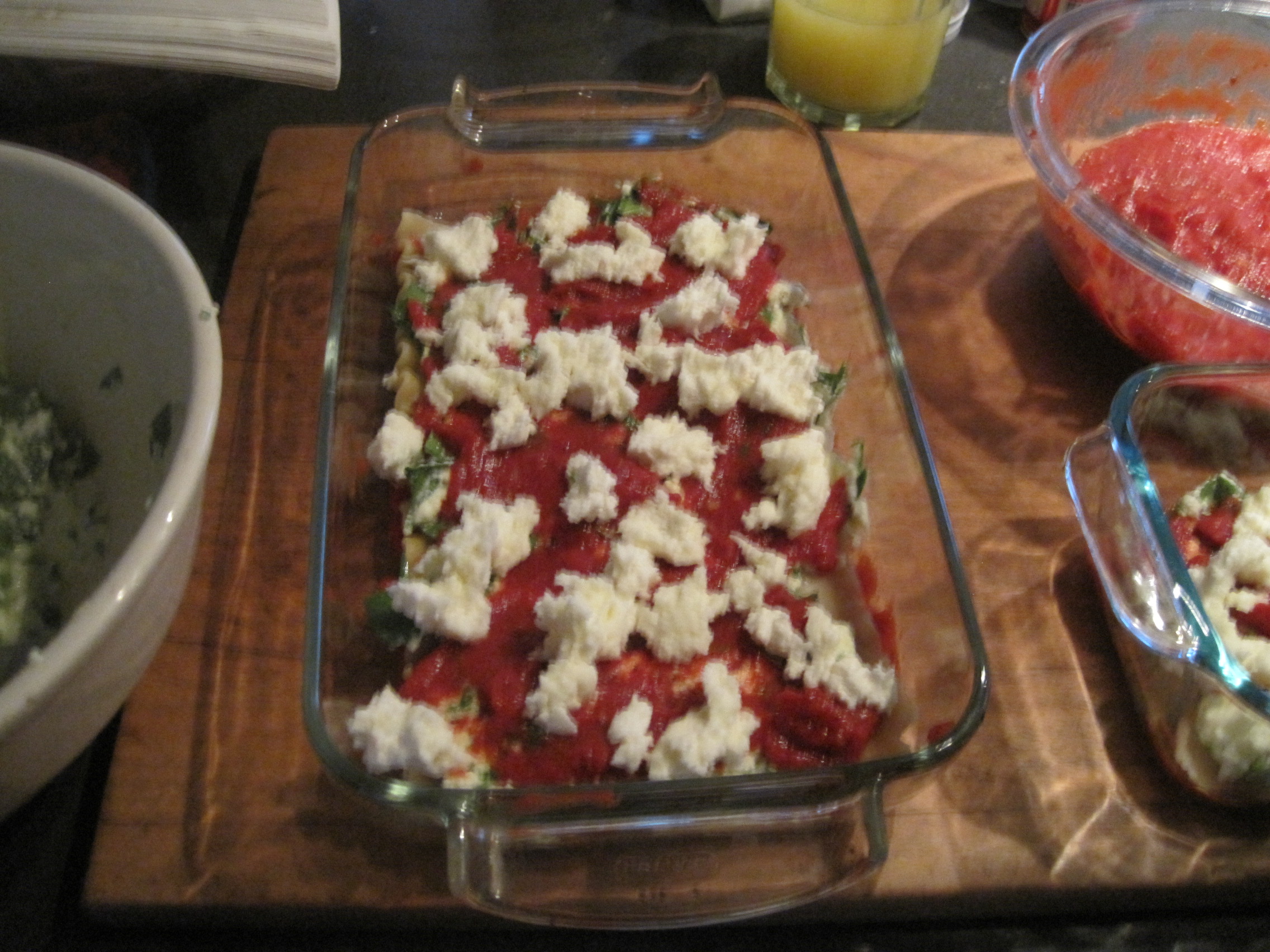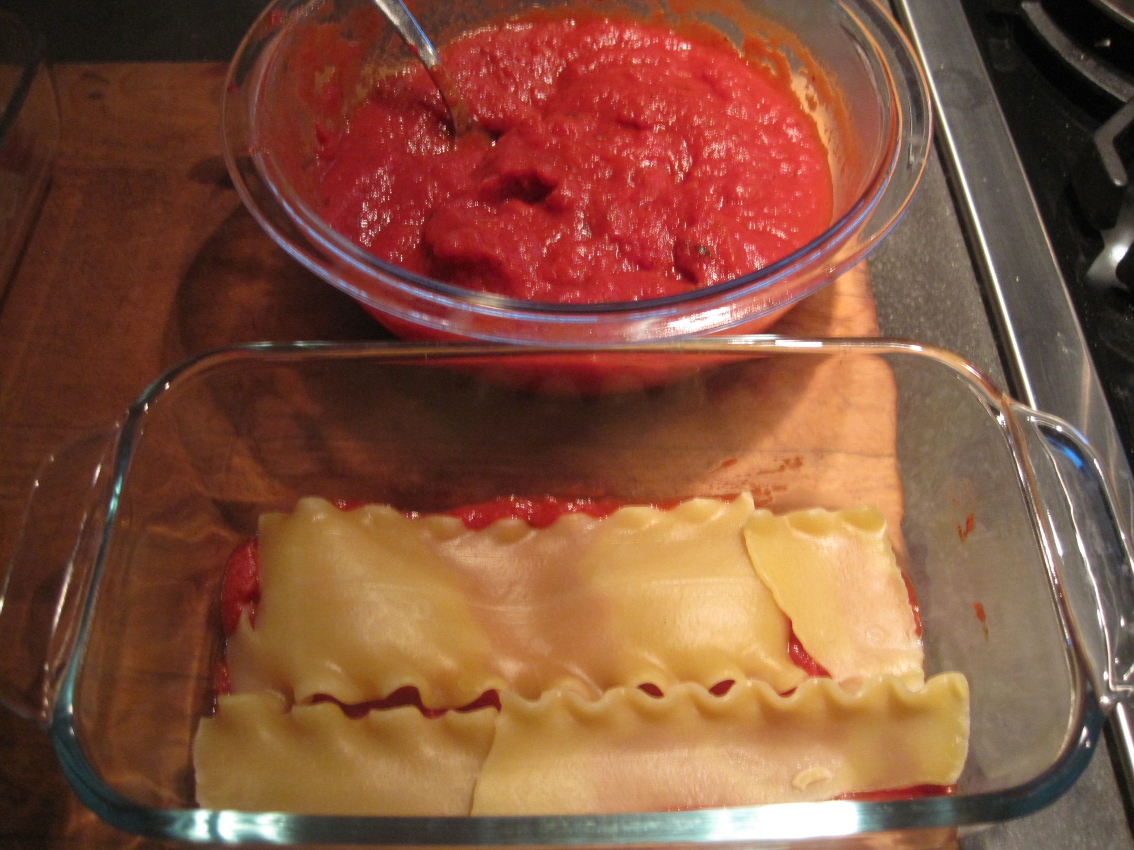Preheat the oven to 375˚. Mix the sauce and tomato paste, and spread a little over the bottom of the pan(s). Cover with a layer of noodles (use 1/3 of the noodles). Using half of the filling, cover the noodles with the spinach and cheese mix. Add 1/3 of the remaining sauce, then cover with 1/2 of the mozzarella.
