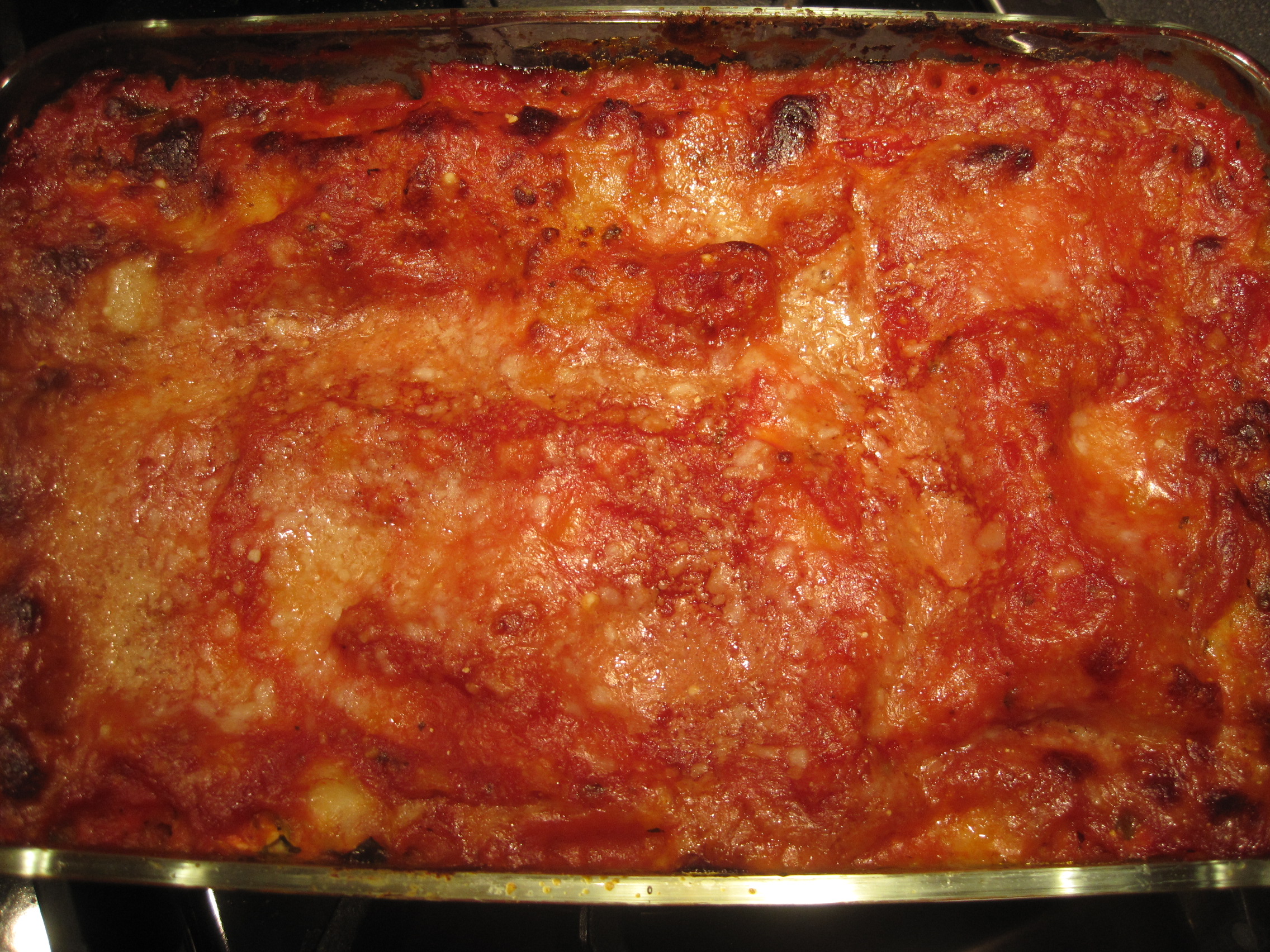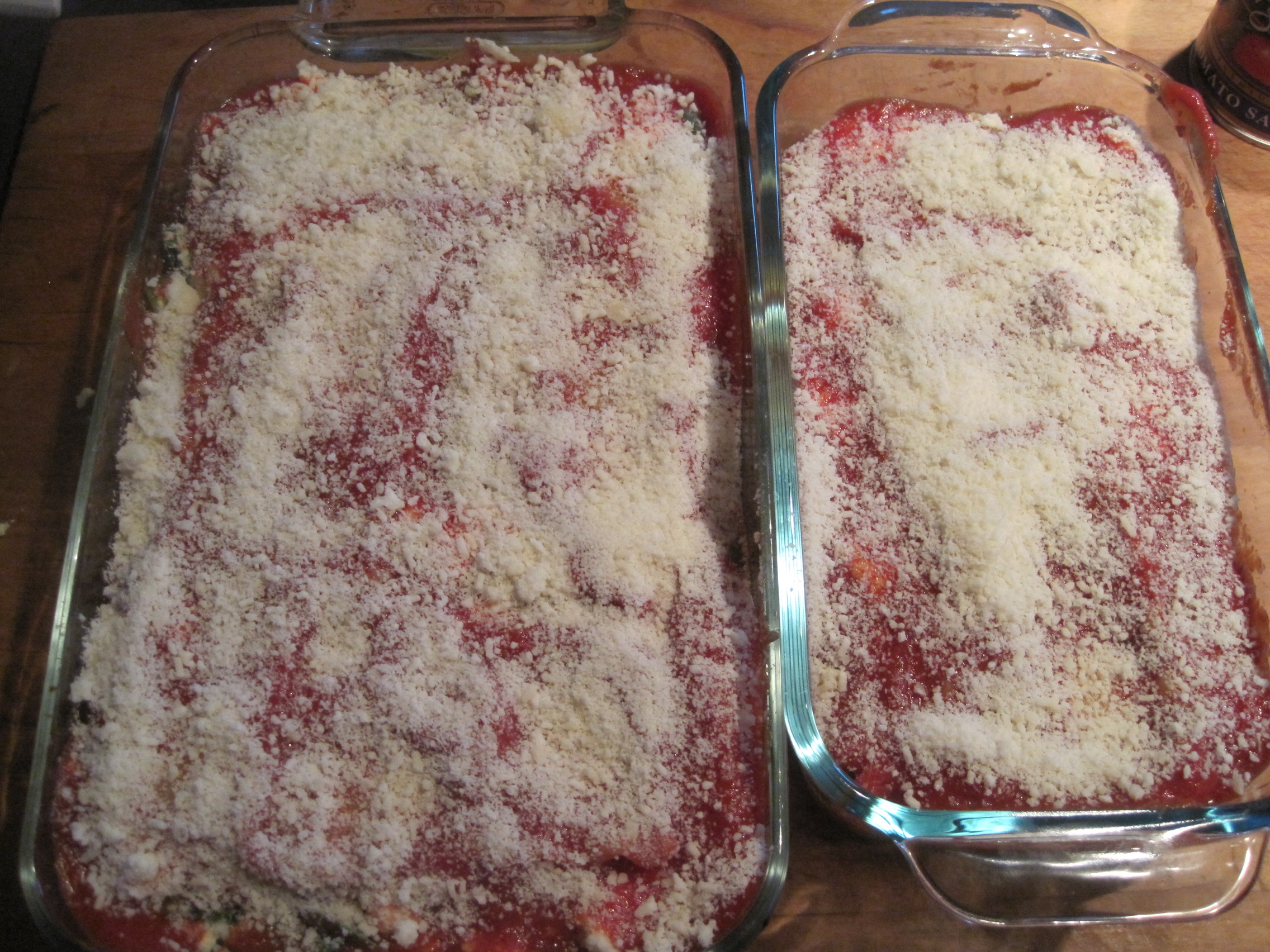Getting the hang of it? Next follows another 1/3 of the noodles, then the second half of the spinach-and-cheese filling. Cover with half of the remaining sauce, mozzarella, and the rest of the noodles. Lastly, cover with the rest of the sauce and sprinkle with parmesan or romano.
