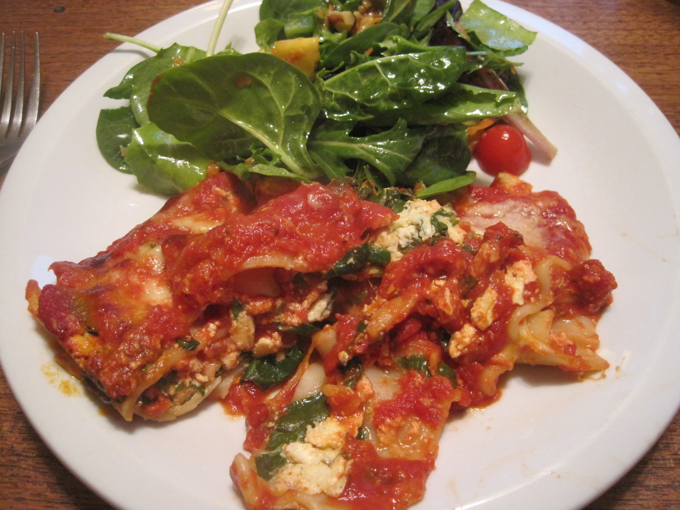Spinach lasagne – warm, filling and tasty. This dish takes about an hour and 1/2 to make, but can be prepared in advance and stored in the fridge. The original recipe calls for it to be baked in a 9×13 pan, but it can also be cooked in several smaller pans.