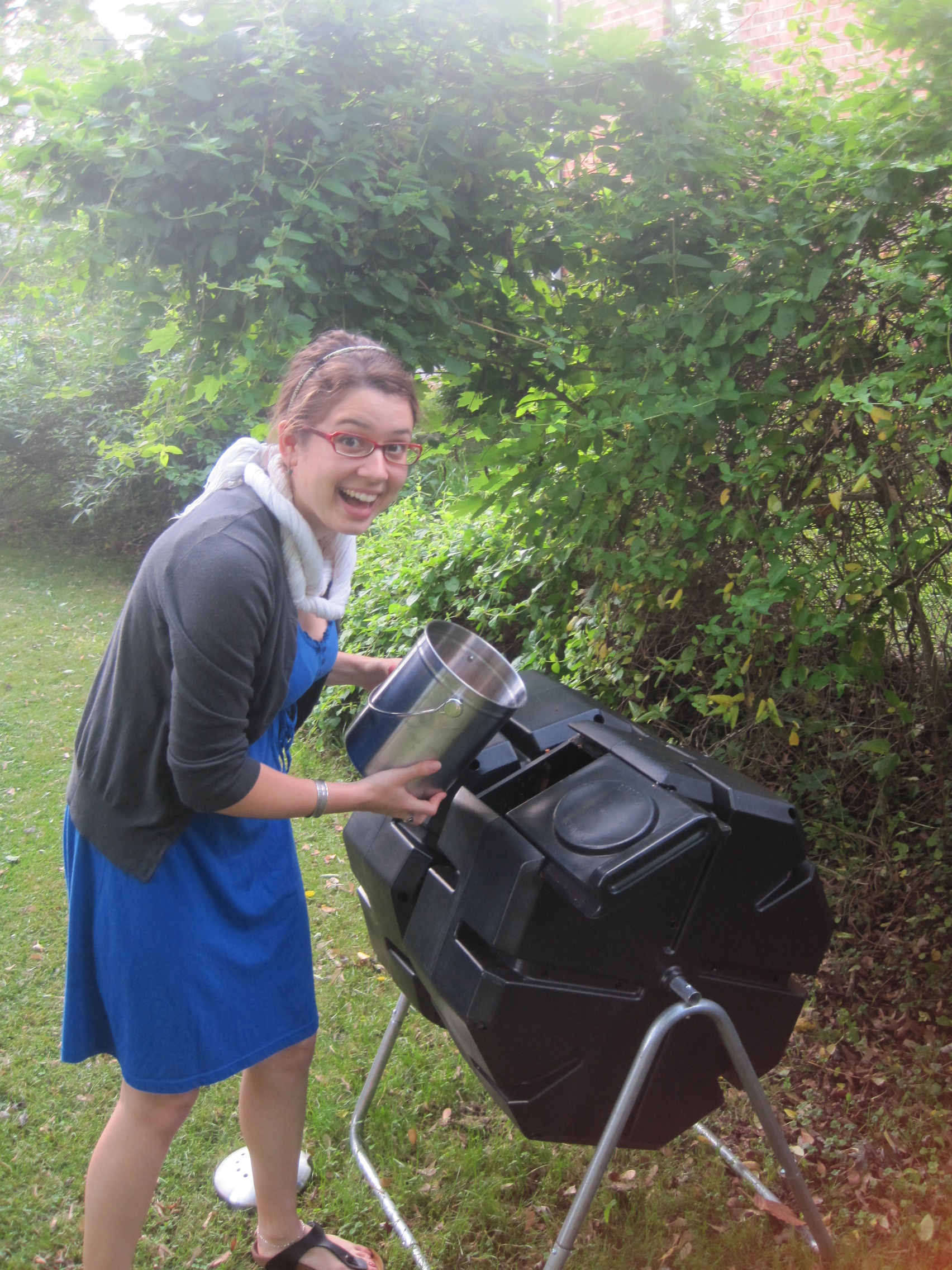 Why yes, it is a dual-batch rotating compost tumbler! I chose a bin because I didn’t want to encourage rodent visits, a dual-batch model to have two stages of decomposition and a rotating one for ease of mixing the compost.