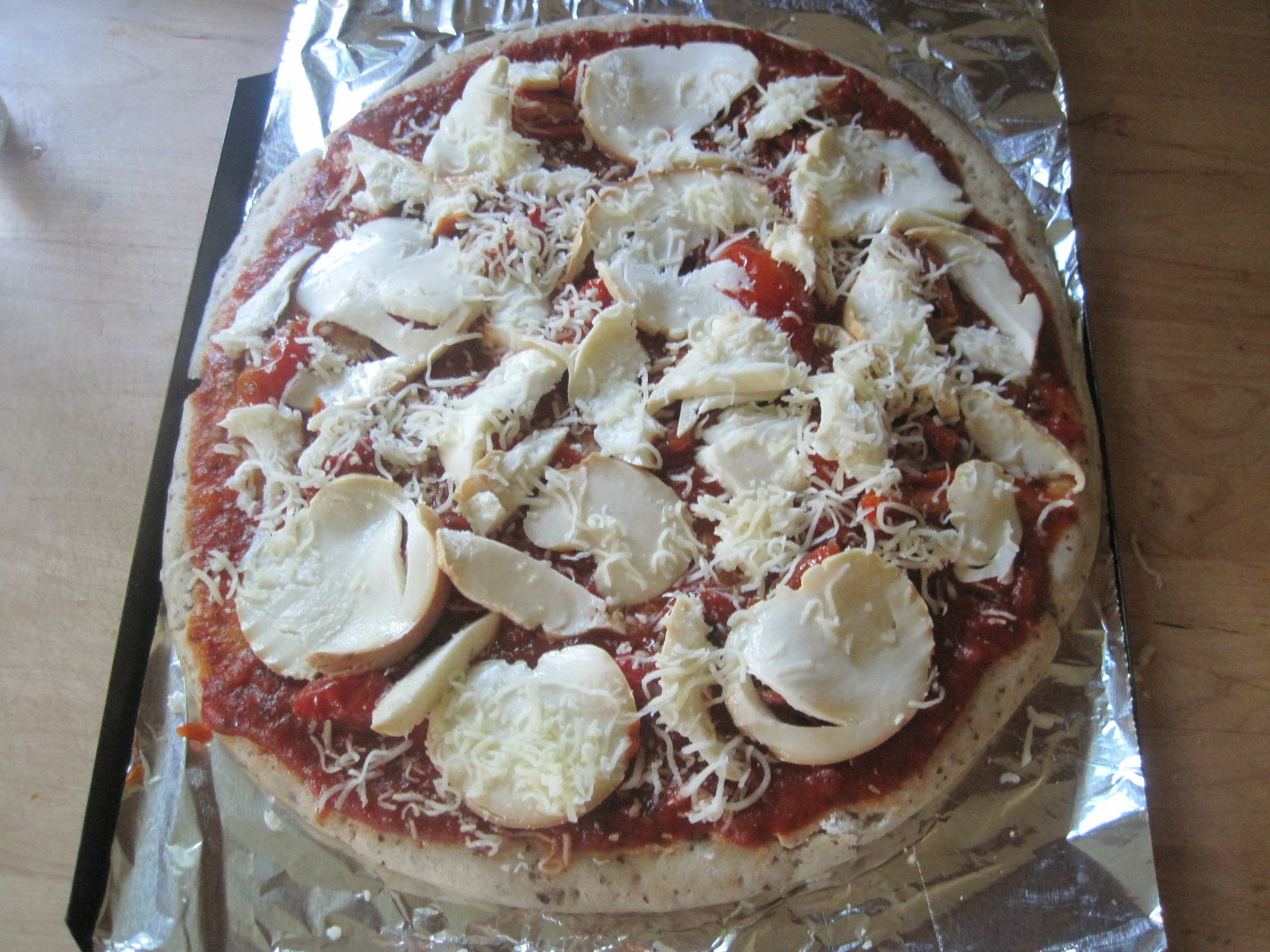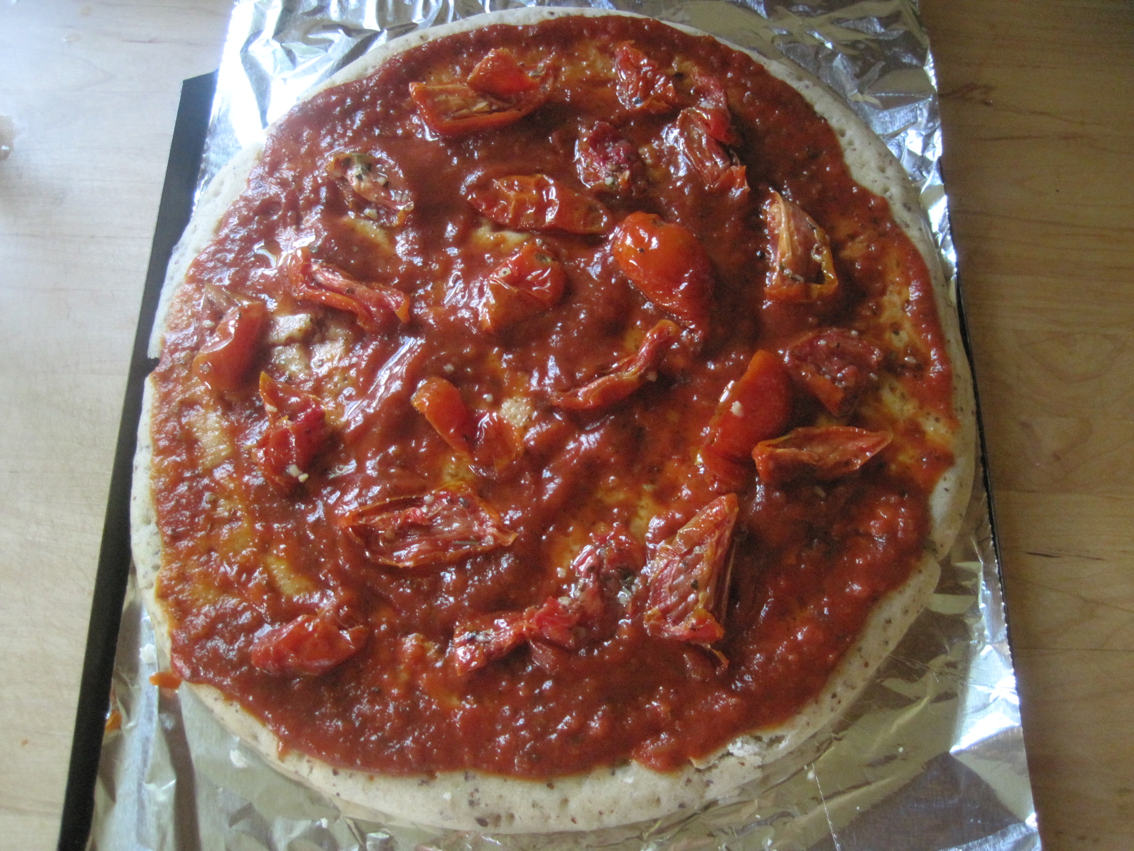 Meanwhile, place the pizza crust on aluminum foil over a baking sheet cover the pizza crust with sauce and roasted tomatoes. Then, cover with the slice smoked mozzarella. Some of the sauce will still be visible. Feel free to sprinkle with extra grated mozzarella if you like.