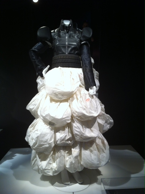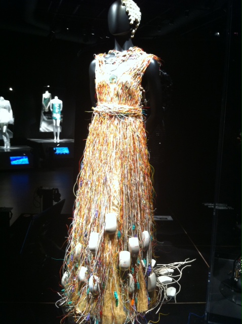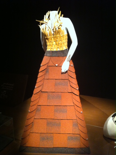 The ONE (Outfits for a New Era) exhibit is a black room with displays of dresses made from excess materials with a blurb, or a video about the material and its problems with environmental soundness. Batteries, roofing materials, styrofoam material, computer mice, dog waste bags, Arizona Tea cans, paper, hair, and about a dozen more. It was a bit overwhelming to try to look at all the dresses and their blurbs, but one stood out: it was a dress in a glass-door refrigerator like one you’d find in a gas station. The dress was made from salmon skin and mussel shells and the blurb was about sustainable seafood.