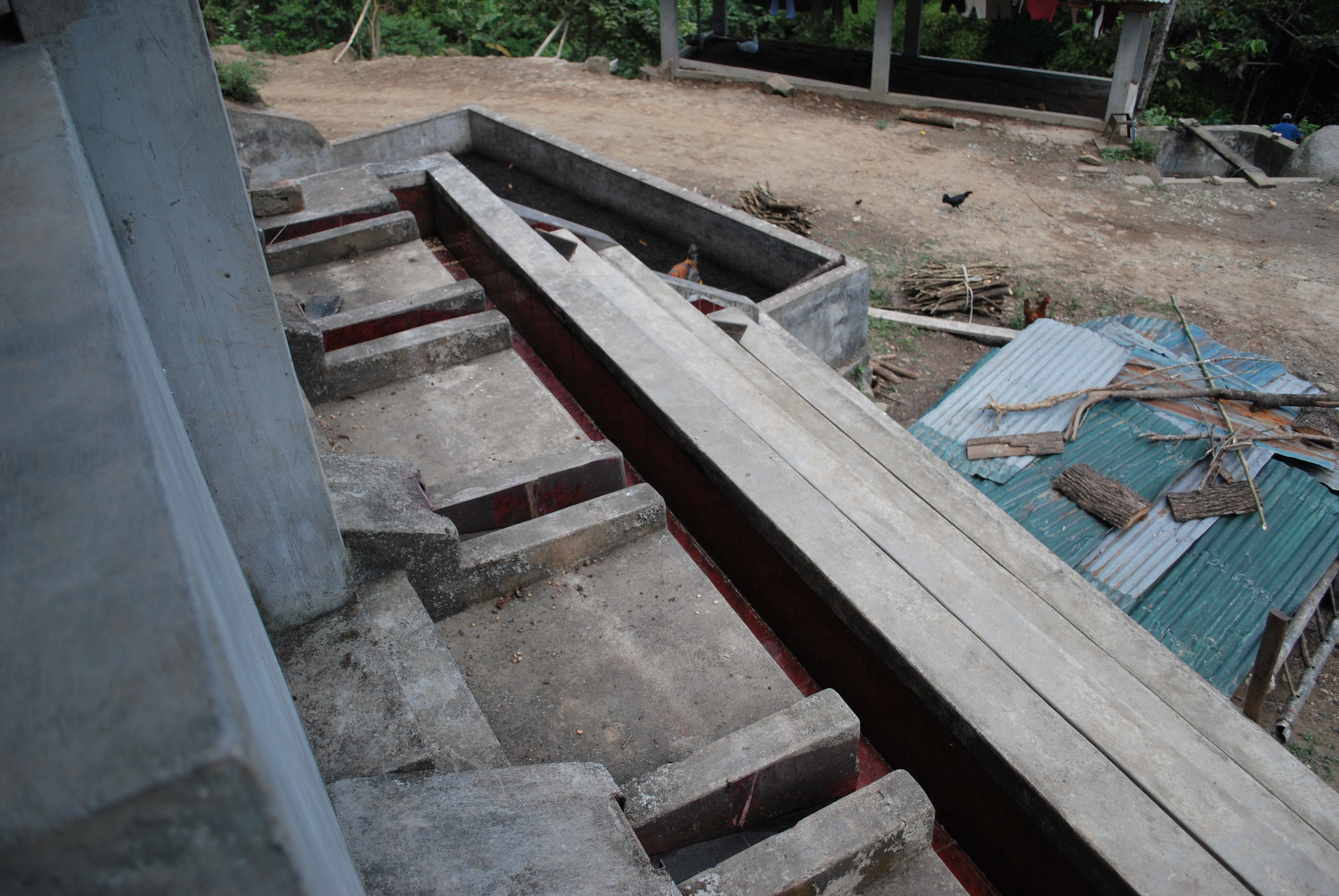 Coffee has been grown in Coyona for 70 years. They use a wet process on the cherries which yields a better quality end bean. Their processing facility is in the middle of the village and is impressive for it’s efficiency. You see, they built it right into the mountain so they could use gravity to their advantage. The entire co-op helped build it – they figured it would ‘cost’ one week of labor per co-op member so they all pitched in, most working more than their one week commitment. Those who were unable to work the week ‘paid’ in coffee to the co-op. Side bar – I particularly loved that the patio where they dried the beans featured soccer goals and seating for community games!